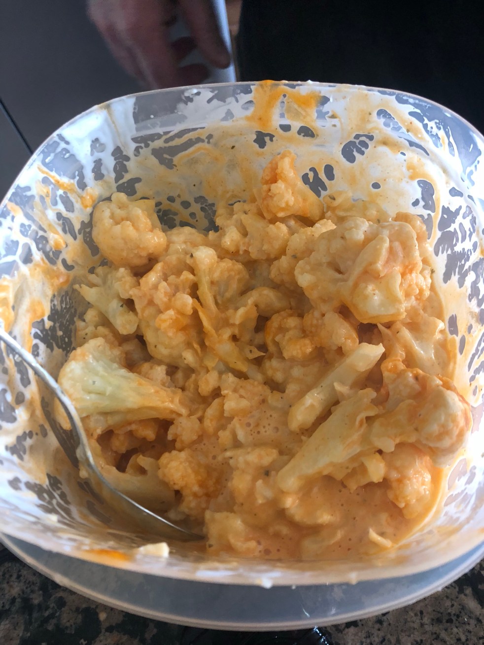 Take the microwaved cauliflower and add buffalo sauce and ranch dressing until coated.